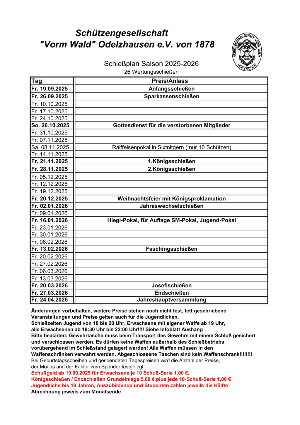 Wer Tagespreise spenden möchte kann gerne mit dem Vorstand Kontakt aufnehmen, um dies im Schießplan berücksichtigen zu lassen.