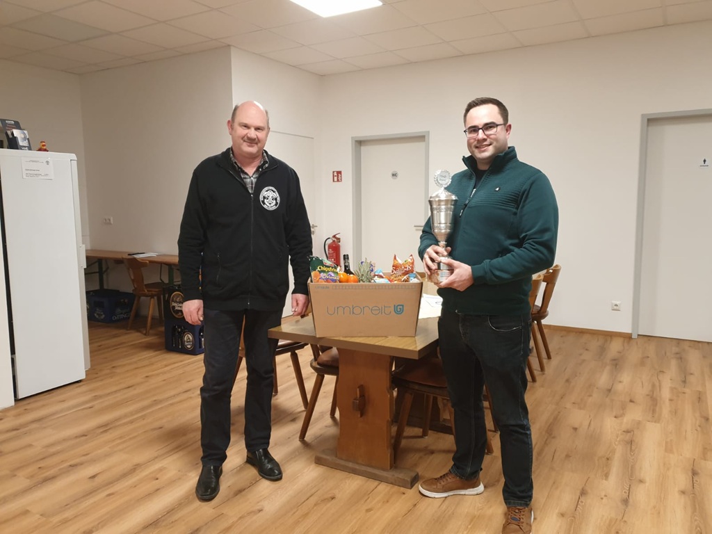 Schon seit vielen Jahren spendet die Familie Hiegl aus Odelzhausen den Hiegl-Pokal als Wanderpokal, zusammen mit einem großzügigen Präsentkorb. So auch dieses Jahr am 17.01.2025. Mit einem 6,4 Teiler sicherte sich Leonhard Hermann mit dem besten Schuss des Abends unter den Standard-Schützen den Wanderpokal mitsamt Präsentkorb.